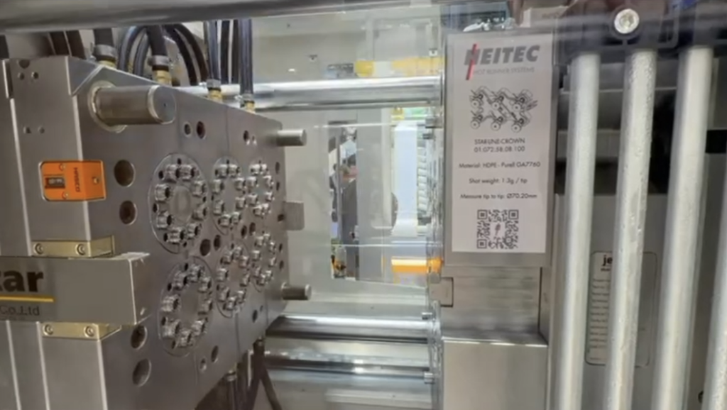 Additionally, the Sepro Group showcased the STAR-LINE nozzle system in real production. The live demonstration highlighted the system’s precision, energy efficiency, and dynamic performance under full operating conditions using a 48-cavity mold for side injected screw caps (HDPE, 1.3 g each).